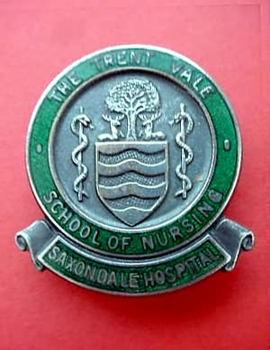 ..... Short Description ...... The Trent Vale School of Nursing Saxondale Hospital, Hospital badge was awarded to nurses on completion of training. It is (shape) in shape and made from (materials), with the hospital name around the circumference. The badge weighs (weight) grams and has a (rear pin/button hole) fixing. Picture: The central design is of (description). Badges (were/were not) named and dated with the name of the recipient on the reverse. ..... |
