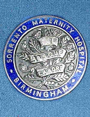 Short Description ...... The Sorrento Maternity Hospital, Birmingham Hospital badge was awarded to nurses on completion of training. It is circular in shape and made from (materials), with the hospital name around the circumference. The badge weighs (weight) grams and has a (rear pin/button hole) fixing. Picture: The central design is of (description). Badges (were/were not) named and dated with the name of the recipient on the reverse. |