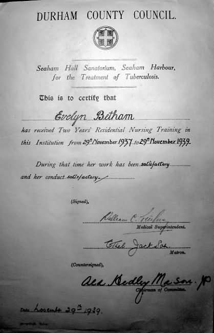 Evelyn Betham - Seaham Hall Training Certificate - awarded 29th November 1939.