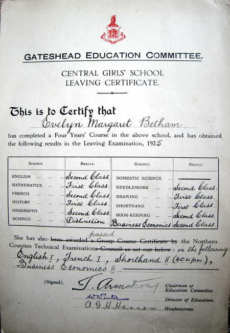 Eveln Betham.- Gateshead Central Girls' School Leaving Certificate - 1935.