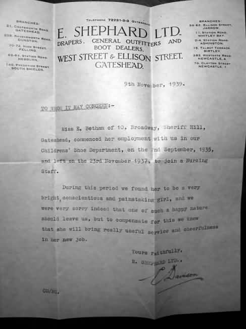 Evelyn Betham - Original Reference from Shephards of Gateshead - 9th November 1937.