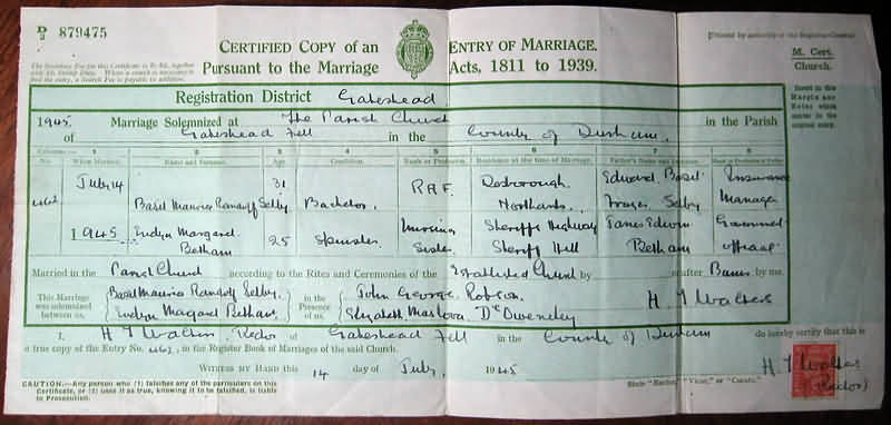 Evelyn Margaret Betham and Basil Maurice Randolph Selby - Marriage Certificate - 14th July 1945.