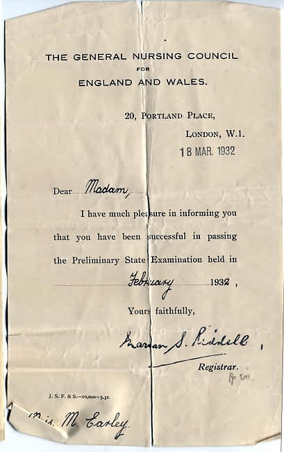 1932 GNC letter of successful SRN Preliminary Examinations.