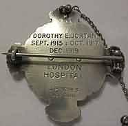 (Fig.2) I bought this badge primarily as it had a different box to other London Hospital badges I own, and had dates of training which predated the date of the London Hospital badge's first date of issue. Researching a name on a badge has led me to research many interesting aspects of the history and development of nursing, and hospitals, alongside discovering a little more about the person who was awarded the badge and wore it. Dorothy entered the London Hospital on September 12th 1915, aged 29, her archived records state that she had been a children's nurse, but did not say where, when or if she had trained, but because of this she did not do any Preliminary Training School and entered straight into the hospital. Her patients are recorded as being large proportion of soldiers; the London took in the first injured soldiers of WW1.In the first two years, Dorothy spent at least 8 months nursing wounded soldiers. Other nursing experiences included ophthalmology, neonatal care and a patient undergoing salphingo-oopherectomy. In 1917, she developed German measles whilst at home, requiring a small amount of sick leave. Her post qualification report said: "D.E.J. came straight into hospital so had not the advantage of our Preliminary Training Home. She was not well suited for training and showed a certain amount of quiet strength of character. She readily adapted herself for institution life and her neat and nurse like appearance as well as her quiet manners were a considerable asset to her in her training. D.J. gained a reputation for good steady reliable work and sound common sense...she had a bright, hopeful manner with the patients, which inspired confidence. She was able to think for her patients and had a keen perspective at what would add to their comfort. Her manner most nurse like. She was liked by the men who had confidence in her and sister was sorry to lose her." (1) Dorothy's exam and work were satisfactory, conduct very good, she passed sick room cookery theory with honours and practical, getting a 2nd and she was certificated on December 16th 1919.Eva Luckes as Matron is reported to have said of Dorothy; "Matron was also equally [of the view]... to appoint DJ to the hospital or the private staff feeling sure that she will do credit to her training school in either branch of the work "... Janet Scott, Matrons Assistant.(1) Eva Luckes died in 1918, and was unwell for some time before her death, being confined to her wheelchair with Rheumatoid Arthritis; therefore how well she knew each probationer is questionable, given that there were up to 220 at any one time.(1) Dorothy transferred to the private staff, as nurse no 243, on Nov 29 1917, aged 31, and worked on the Private Staff until 1925. During this time, Dorothy cared for a wide variety of patients including people with pneumonia, marasmus, septic neck glands, and gastro enteritis, fractured ribs, Influenza, Addison's, Cardiac illness, Buttock Abscess's, carcinoma, Heart disease and people who had fits. The London hospital had 'the largest and best-known service of its kind at the time, one which numbered the many prominent members of society amongst its clients.' (10) Dorothy completed her massage training from October 1919 - January 1920; massage training was sometimes offered to nurses on qualification. In 1894, four nurses started the Society of trained Masseuses', the forerunner of today's Chartered Physiotherapy association. "The four nurses wish to protect their profession after stories in the press warn young nurses and the public of unscrupulous people offering massage as a euphemism for other services." (6) In 1920, she cared for patients in Tonbridge Kent, with appendicitis, colitis and diphtheria, and others with Encephalitis, Angina and those requiring massage treatment. In 1922-24, she cared for "boys" at Eagle house school, and also stayed at Wellington College for three weeks, where she cared for 130 boys aged 14-19 with measles; her children's training was used again. In 1923 Dorothy registered as a nurse on February, her GNC number was 11568.(3) Dorothy continued to travel widely as a Private Nurse of the London Hospital; in 1924 she cared for patients at home in Devon, Shropshire, Bedfordshire and Dublin, where she nursed a lady with an ovarian cyst and a gentleman with an intestinal obstruction for 14 weeks! In 1925 prior to transferring back to the Hospital Staff, she nursed a burns patient in Essex and another with pneumonia. (2)