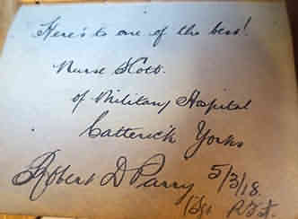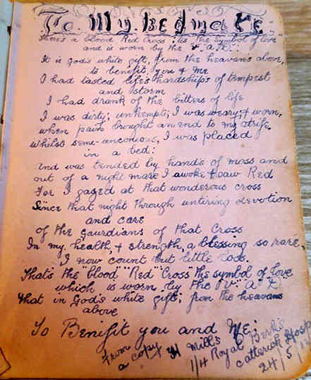 Amy’s ‘V.A.D’ Autograph book was recently sold at auction; inside she had written her name, along with details of the two war hospitals in which she worked during World War One. Using this information it has been possible to find her living family, who knew her well, and who still have photographs of her, including two of her as a V.A.D. Amy was the eldest child of five and was born at 35 Windsor Street, Nottingham on 23rd December 1896 to Mark Scott, a Baker Journeyman and his wife Isabella.5 Family Oral History recalls that Amy’s father Mark started his working life as a Baker and worked at J D Marsdons, a large bakers in Nottingham, but then began to experience respiratory problems and became an odd job man around the place. He would light the ovens for the bakers and do some paper work. Amy’s mother was a tailoress who worked from home; ‘She was a really lovely lady who would light up any room’.4 In 1911 Amy,