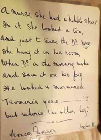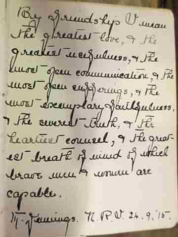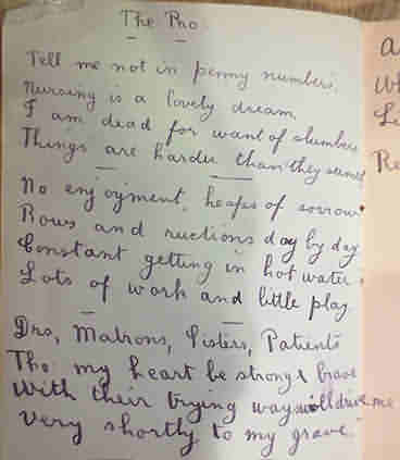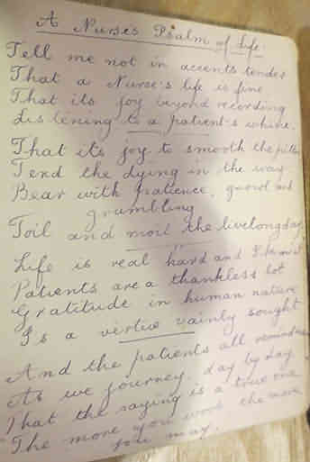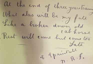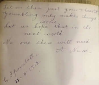 Isabella Tiplady 1892-1971? Isa’s autograph book, thought to contain autographs of nurses with whom she trained as well as family members and friends. This is a small album, and would have fitted in a capacious uniform pocket. The album is different from those kept by VAD’s and nurses during WW1, it reflects the nurses’ thoughts and wishes on themes such as exhaustion, nursing, love and life. Isabella was the sixth of seven children born to Stephen, a Coal Miner who worked in Durham as a shifter for the Stella Coal company in 1911 and his wife Isabella. She may have married a John J Longstaff in 1917, and died in 1971. So far contact has been made with her sister Elizabeth’s descendants- but no photo has been found of Isabella or Elizabeth! Isa appears to
