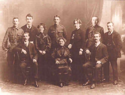 First World War: Standing L to R: George (Patricia Mumford’s grandfather) born 1886, Herbert born 1881, Mary born 1866, Sarah Alice born 1872, William born 1888, Joseph born 1875, Seated L to R: Alfred born 1879, Emily (their mother) born 1846, Harry born 1876. Both James the eldest son born in 1870 and their father Joseph predeceased the photograph. Alice was in