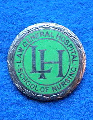 Short Description ...... The Law General Hospital Lanarkshire Hospital badge was awarded to nurses on completion of training. It is made from (materials). The badge weighs (weight) grams and has a (rear pin/button hole) fixing. Picture: The central design is of is basically a square red cross supporting and two circles with the hospital and school name around the circumferences with the central circle containing the hospital crest. The badges (were/were not) named and dated with the name of the recipient on the reverse ....... |