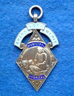 ..... Short Description ...... The Award of Merit Municipal Hospital Hospital badge was awarded to nurses on completion of training. It is circular in shape and made from (materials), with the hospital name around the circumference. The badge weighs (weight) grams and has a (rear pin/button hole) fixing. Picture: The central design is of (description). Badges (were/were not) named and dated with the name of the recipient on the reverse. ..... |