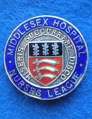 Short Description ...... The Middlesex Hospital Nurses League, Middlesex Hospital badge was awarded to nurses on completion of training. It is circular in shape and made from (materials), with the hospital name, date of the hospitals construction and motto inscribed in Latin around the circumference.