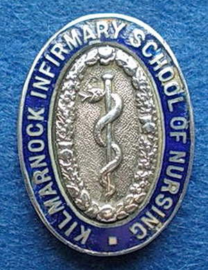 Short Description ...... The Kilmarnock Infirmary School of Nursing Scotland Hospital badge It is an oval shape with a with the hospital name around the periphery. It is made from bronze metal. The badge weighs (weight) grams and has the top looped suspension bar fixing. Picture: The central circular design contains the name of the hospital above with the central picture & lamp cast in relief. Badges (were/were not) named and dated with the name of the recipient on the reverse. |