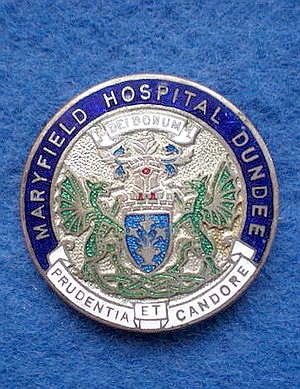 Short Description ...... The Maryfield Hospital Dundee Scotland Hospital badge was awarded to nurses on completion of training. It is circular in shape looped suspension bar above and is made from (materials). The hospital name The badge weighs (weight) grams and has a (rear pin/button hole) fixing. Picture: The central design is i (description). Badges (were/were not) named and dated with the name of the recipient on the reverse. ...... |