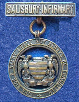 ...... Short Description ...... The Salisbury Infirmary Wiltshire Hospital badge was awarded to nurses on completion of training. It is circular in shape and made from (materials), with the hospital name around the circumference. The badge weighs (weight) grams and has a (rear pin/button hole) fixing. Picture: The central design is of (description). Badges (were/were not) named and dated with the name of the recipient on the reverse. ...... |