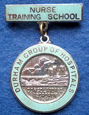 ...... Short Description ...... The Nurse Training School Durham Group of Hospitals Hospital badge was awarded to nurses on completion of training. It is oval in shape and made from (materials), with the hospital name around the circumference. The badge weighs (weight) grams and has a (rear pin/button hole) fixing. Picture: The central design is of (description). Badges (were/were not) named and dated with the name of the recipient on the on the reverse. ...... |