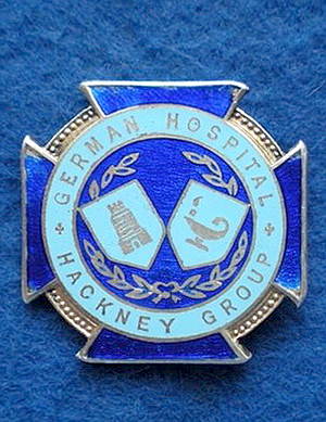 ...... Short Description ...... The German Hospital Hackney Group London Hospital badge was awarded to nurses on completion of training. It is circular in shape and made from silver, with the hospital name around the Periphery. The badge weighs (weight) grams and has a (rear pin/button hole) fixing. Picture: The central design is of (description). Badges (were/were not) named and dated with the name of the recipient on the reverse. ...... |