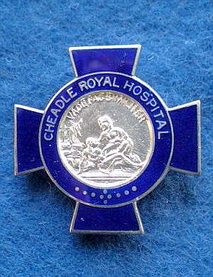 Short Description ...... The Cheadle Royal Hospital Cheshire Hospital badge was awarded to nurses on completion of training. It is oval in shape and made from (materials), with the hospital name around the circumference. The badge weighs (weight) grams and has a (rear pin/button hole) fixing. Picture: The central design is of (description). Badges (were/were not) named and dated with the name of the recipient on the reverse. |