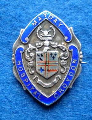 Short Description ...... The Mayday Hospital Croydon London Hospital badge was awarded to nurses on completion of training. It is oval in shape looped suspension bar above and is made from (materials). The hospital name The badge weighs (weight) grams and has a (rear pin/button hole) fixing. Picture: The central design is i (description). Badges (were/were not) named and dated with the name of the recipient on the reverse. ...... |