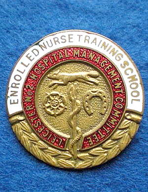 ..... Short Description ...... The Leicester No 2 HMC SEN Nurse Training School Hospital badge was awarded to nurses on completion of training. It is circular in shape and made from silver with the school name around the circumference. The badge weighs (weight) grams and has a (rear pin/button hole) fixing. Picture: The central design is of (description). Badges (were/were not) named and dated with the name of the recipient on theon the reverse. ...... |