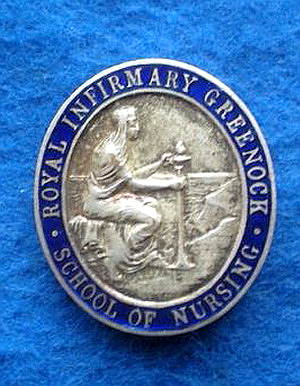 ...... Short Description ...... The Royal Infirmary Greenock School of Nursing Scotland Hospital badge was awarded to nurses on completion of training. It is crossed oval in shape and made from (materials), with the hospital name around the circumference. The badge weighs (weight) grams and has a (rear pin/button hole) fixing. Picture: The central design is of (description). Badges (were/were not) named and dated with the name of the recipient on the reverse. ...... |