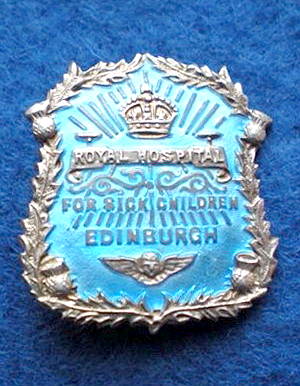 ...... Short Description ...... The Royal Hospital for Sick Children Edinburgh Scotland Hospital badge was awarded to nurses on completion of training. It is square in shape with cropped corners and is made from (materials). The badge weighs (weight) grams and has a (rear pin/button hole) fixing. Picture: The central design is of the college logo and inscription against a blue enamel background. Badges (were/were not) named and dated with the name of the recipient on the reverse. ...... |