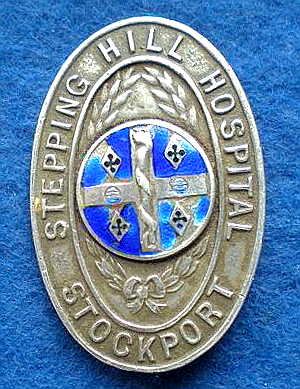 Short Description ...... The Stepping Hill Hospital Stockport Cheshire badge was awarded to nurses on completion of training. It is circular in shape and made from silver with the hospital name around the periphery. The badge weighs (weight) grams and has a (rear pin/button hole) fixing. Picture: The central design is of (description). Badges (were/were not) named and dated with the name of the recipient on the reverse. |