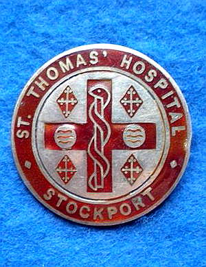 ..... Short Description ...... The St. Thomas' Hospital Stockport Cheshire Hospital badge was awarded to nurses on completion of training. It is oval in shape and made from (materials), with the hospital name and motto around the circumference. The badge weighs (weight) grams and has a (rear pin/button hole) fixing. Picture: The central design is of (description). Badges (were/were not) named and dated with the name of the recipient on the reverse. ..... |