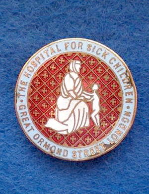 ...... Short Description ...... The Great Ormond Street Hospital for Sick Children London Hospital badge was awarded to nurses on completion of training. It is circular in shape and made from (materials), with the hospital name is around the centre circumference. The badge weighs (weight) grams and has a (rear pin/button hole) fixing. Picture: The central design is of (description). Badges (were/were not) named and dated with the name of the recipient on the reverse. ...... |
