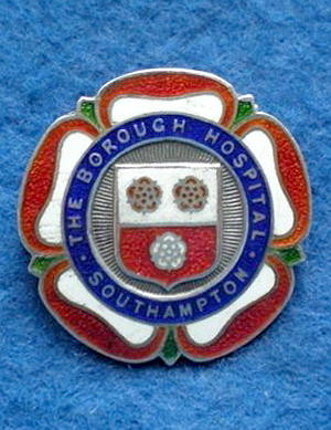 Short Description ...... The Borough Hospital Southampton Hampshire Hospital badge was awarded to nurses on completion of training. It is made from (materials). The badge weighs (weight) grams and has a (rear pin/button hole) fixing. Picture: The central design is of is basically a square red cross supporting and two circles with the hospital and school name around the circumferences with the central circle containing the hospital crest. The badges (were/were not) named and dated with the name of the recipient on the reverse ....... |