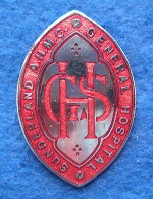 Short Description ...... The Sunderland AHMC General Hospital Tyne & Wear badge was awarded to nurses on completion of training. It is circular in shape and made from silver with the hospital name around the periphery. The badge weighs (weight) grams and has a (rear pin/button hole) fixing. Picture: The central design is of (description). Badges (were/were not) named and dated with the name of the recipient on the reverse. |