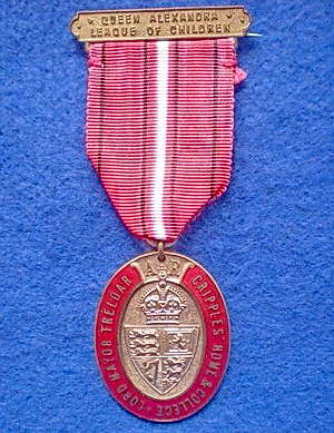 Short Description ...... The Lord Mayor Treloar Cripples Home association badge was awarded to nurses on completion of training. It oval in shape and made from (materials), with the hospital name, date of the hospitals construction and nscribed around the circumference. The badge weighs (weight) grams and has a (rear pin/button hole) fixing. Picture: The central design is of (description). Badges (were/were not) named and dated with the name of the recipient on the reverse. |