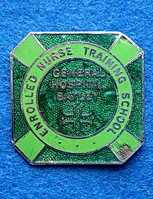 ..... Short Description ...... The Enrolled Nurse Training School General Hospital Batley Hospital badge was awarded to nurses on completion of training. It is circular in shape and made from (materials), with the hospital name around the circumference. The badge weighs (weight) grams and has a (rear pin/button hole) fixing. Picture: The central design is of (description). Badges (were/were not) named and dated with the name of the recipient on the reverse. ..... |