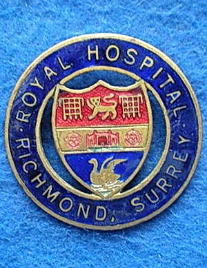 Short Description ...... The Royal Hospital Richmond, Surrey Hospital badge was awarded to nurses on completion of (length of) training. The badge is circular in shape and made from (materials), with the hospital name outlined around the circumference. The badge weighs (weight) grams and has a (rear pin/button hole) fixing. Picture: The central design is of the xxxx coat of arms and motto inscribed in Latin below the shield. Badges (were/were not) named and dated with the name of the recipient on the reverse.. |