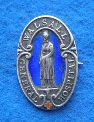 ...... Short Description ...... The Walsall General Hospital Staffordshire Hospital badge was awarded to nurses on completion of training. It is crossed oval in shape and made from (materials), with the hospital name around the circumference. The badge weighs (weight) grams and has a (rear pin/button hole) fixing. Picture: The central design is of (description). Badges (were/were not) named and dated with the name of the recipient on the reverse. ...... |
