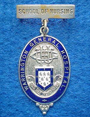 Short Description ...... The Warrington General Hospital School of Nursing Cheshire Hospital badge was awarded to nurses on completion of training. It is oval in shape and made from (materials), with the hospital name around the circumference. The badge weighs (weight) grams and has a (rear pin/button hole) fixing. Picture: The central design is of (description). Badges (were/were not) named and dated with the name of the recipient on the reverse. ...... |