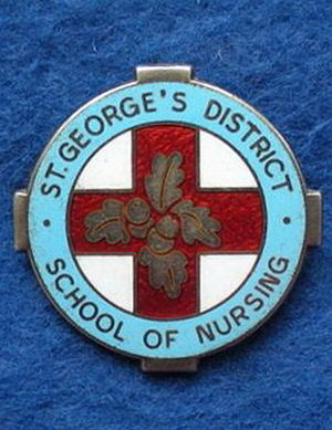 ..... Short Description ...... TheSt. Georges District School of Nursing Hospital badge was awarded to nurses on completion of training. It is circular in shape and made from (materials), with the hospital name around the circumference. The badge weighs (weight) grams and has a (rear pin/button hole) fixing. Picture: The central design is of (description). Badges (were/were not) named and dated with the name of the recipient on the reverse. ...... |