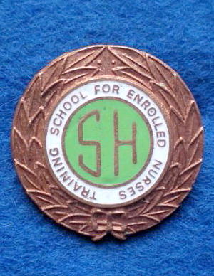 Short Description ...... The SH Training School for Enrolled Nurses Hospital badge was awarded to nurses on completion of training. It is a heart shaped looped suspension bar above and is made from (materials). The hospital name is on the suspension bar. The badge weighs (weight) grams and has a (rear pin/button hole) fixing. Picture: The central design is in silver with the named suspension bar outlined in blue enamel. (description). Badges (were/were not) named and dated with the name of the recipient on the reverse. |