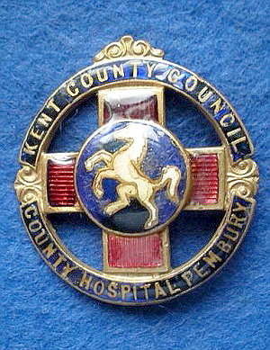 ..... Short Description ...... The Kent County Council County Hospital Pembury Hospital badge was awarded to nurses on completion of training. It is circular in shape and made from (materials), with the hospital name around the circumference. The badge weighs (weight) grams and has a (rear pin/button hole) fixing. Picture: The central design is of (description). Badges (were/were not) named and dated with the name of the recipient on the reverse. ..... |