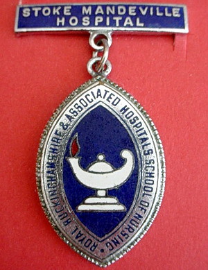 ...... Short Description ...... The Stoke Mandeville Hospital Aylesbury Hospital badge was awarded to nurses on completion of training. It is oval in shape and made from (materials), with the hospital name around the circumference. The badge weighs (weight) grams and has a (rear pin/button hole) fixing. Picture: The central design is of (description). Badges (were/were not) named and dated with the name of the recipient on the on the reverse. ...... |