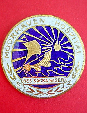 ..... Short Description ...... The Moorhaven Hospital Plymouth Hospital badge was awarded to nurses on completion of training. It is (shape) in shape and made from (materials), with the hospital name around the circumference. The badge weighs (weight) grams and has a (rear pin/button hole) fixing. Picture: The central design is of (description). Badges (were/were not) named and dated with the name of the recipient on the reverse. ..... |
