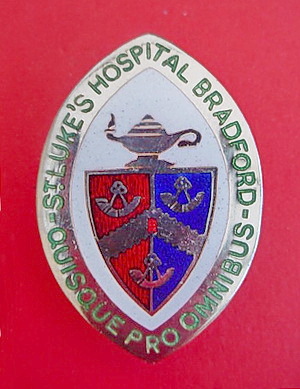 It is (shape) in shape and made from (materials), with the hospital name around the circumference.