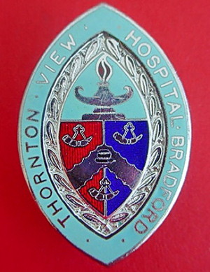 ..... Short Description ...... The Thornton View Hospital Hospital badge was awarded to nurses on completion of training. It is (shape) in shape and made from (materials), with the hospital name around the circumference. The badge weighs (weight) grams and has a (rear pin/button hole) fixing. Picture: The central design is of (description). Badges (were/were not) named and dated with the name of the recipient on the reverse. ..... |