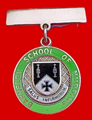 ..... Short Description ...... The Bradford School of Nursing Hospital badge was awarded to nurses on completion of training. It is (shape) in shape and made from (materials), with the hospital name around the circumference. The badge weighs (weight) grams and has a (rear pin/button hole) fixing. Picture: The central design is of (description). Badges (were/were not) named and dated with the name of the recipient on the reverse. ..... |