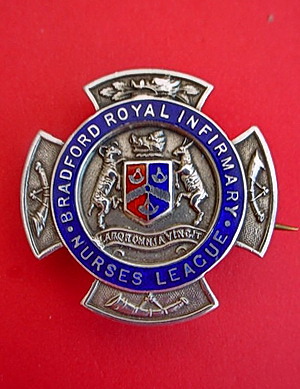 ..... Short Description ...... The Bradford Royal Infirmary Nurses League Hospital badge was awarded to nurses on completion of training. It is (shape) in shape and made from (materials), with the hospital name around the circumference. The badge weighs (weight) grams and has a (rear pin/button hole) fixing. Picture: The central design is of (description). Badges (were/were not) named and dated with the name of the recipient on the reverse. ..... |