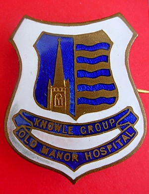 ..... Short Description ...... The Knowle Group Old Manor Hospital Hospital badge was awarded to nurses on completion of training. It is circular in shape and made from (materials), with the hospital name around the circumference. The badge weighs (weight) grams and has a (rear pin/button hole) fixing. Picture: The central design is of (description). Badges (were/were not) named and dated with the name of the recipient on the reverse. ...... |