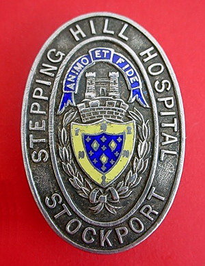 ...... Short Description ...... The Stepping Hill Hospital Stockport Hospital badge was awarded to nurses on completion of training. It is square in shape with cropped corners and is made from (materials). The badge weighs (weight) grams and has a (rear pin/button hole) fixing. Picture: The central design is of the college logo and inscription against a blue enamel background. Badges (were/were not) named and dated with the name of the recipient on the reverse. ...... |