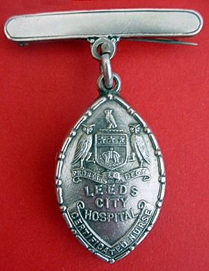 ...... Short Description ...... The Leeds City Hospital Hospital badge was awarded to nurses on completion of training. It is circular in shape and made from (materials), with the hospital name around the central circumference. The badge weighs (weight) grams and has a (rear pin/button hole) fixing. Picture: The central design is of (description). Badges (were/were not) named and dated with the name of the recipient on the reverse. ...... |