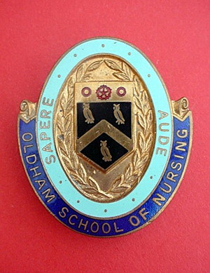 ..... Short Description ...... The Oldham School of Nursing Hospital badge was awarded to nurses on completion of training. It is (shape) in shape and made from (materials), with the hospital name around the circumference. The badge weighs (weight) grams and has a (rear pin/button hole) fixing. Picture: The central design is of (description). Badges (were/were not) named and dated with the name of the recipient on the reverse. ..... |