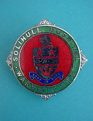 ..... Short Description ...... The Solihull Hospital Warwickshire Hospital badge was awarded to nurses on completion of training. It is (shape) in shape and made from (materials), with the hospital name around the circumference. The badge weighs (weight) grams and has a (rear pin/button hole) fixing. Picture: The central design is of (description). Badges (were/were not) named and dated with the name of the recipient on the reverse. ..... |