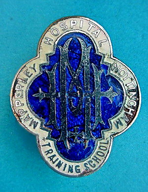 ..... Short Description ...... The Mapperley Hospital Nottingham Training School, Nottingham Hospital badge was awarded to nurses on completion of training. It is (shape) in shape and made from (materials), with the hospital name around the circumference. The badge weighs (weight) grams and has a (rear pin/button hole) fixing. Picture: The central design is of (description). Badges (were/were not) named and dated with the name of the recipient on the reverse. ..... |