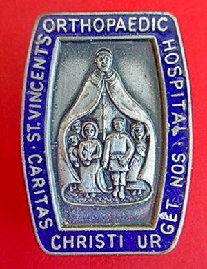 ..... Short Description ...... The St Vincent's Orthopaedic Hospital Birmingham Hospital badge was awarded to nurses on completion of training. It is (shape) in shape and made from (materials), with the hospital name around the circumference. The badge weighs (weight) grams and has a (rear pin/button hole) fixing. Picture: The central design is of (description). Badges (were/were not) named and dated with the name of the recipient on the reverse. ..... |